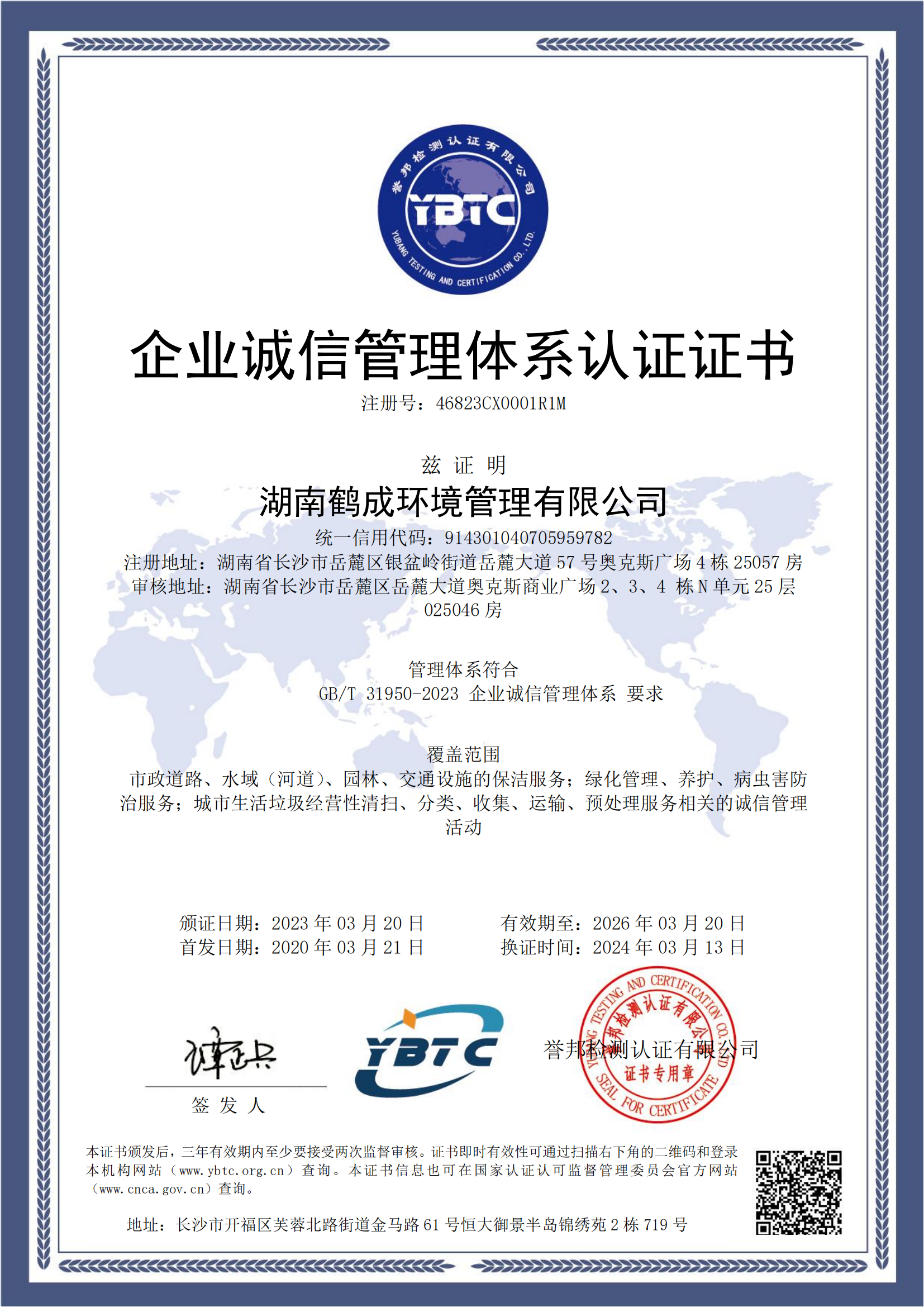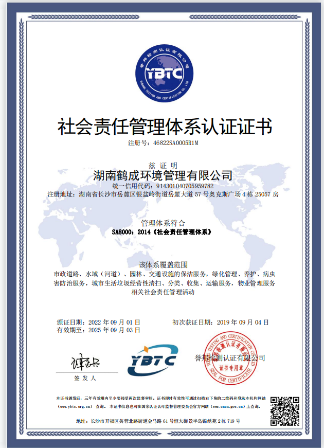 湖南鹤成环境理有限公司,成立2013q?月,原名长沙鹤成景观实业发展有限公司Q经q近几年的飞速发?各方资金的引?加之各界C会(x)力量的大力支?我司已发展成Z家实力雄厚的专业城乡环境化一体化q营商?br/>       目前公司总部自有办公面积500多^方米,座落在湖南省长沙?jng)岳麓区奥克斯广场,现有员?000余hQ其中管理h?26人,技术h?5人,公司配备行业优质的清z机械设备,现有多功能机扫R、大型洗扫R、自卸式垃圾清运车、高压清zR、高压水车、垃?qx)车、压~垃圾R、高温高压洗地机、新能源车、E查R{?00余辆。ؓ(f)方便理公司环卫车辆、优化出行\Uѝ高效指导环卫工作,公司搭徏?jin)鹤成环境智慧环卫管理云q_Q对我司车辆q行数字化、专业化、精l化理。公怸要经营市(jng)攉K路清z维护、物业清z维护、园林绿化工E服务、风景园林工E设计与施工、交通设施的清洗l护、城?jng)生zd?攉q输、绿化管理等服务目?br/>